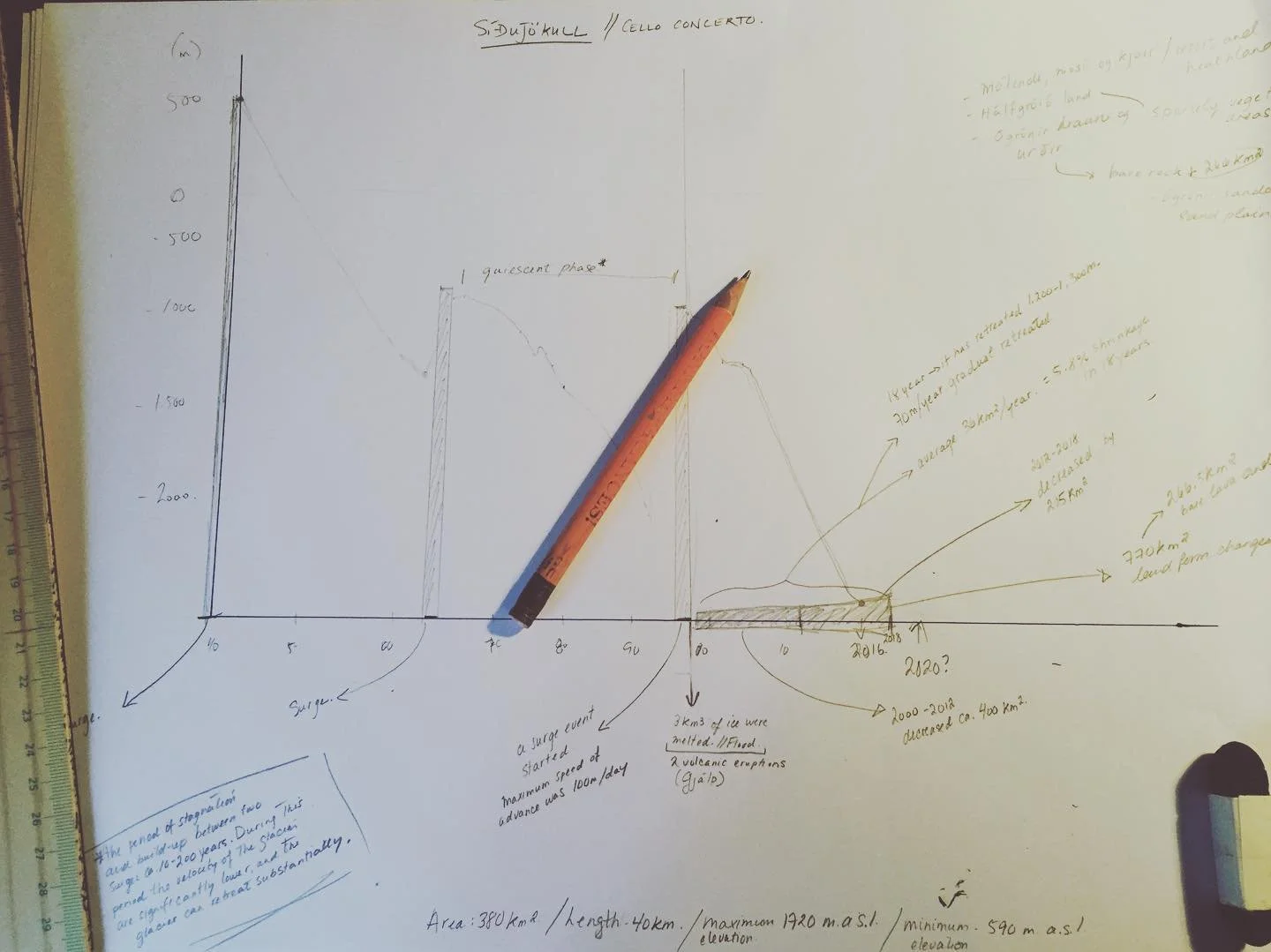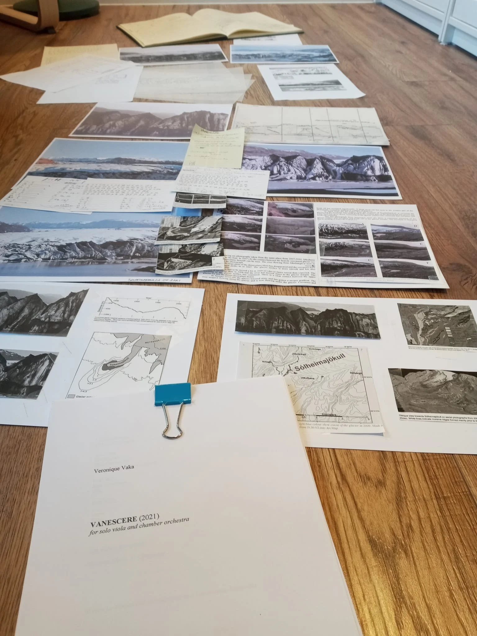 The work Gemæltan began when Veronique found an old map of the area of Síðujökull and compared it with a modern one. The change was alarming. The intention behind Gemæltan is to create awareness of climate change by an abstract representation of the vanishing landscape and the glacial afterglow, with a title and a programme note leading the audience to active listening. The approach is almost scientific; the piece is shaped by climate change. By going through texts and gathering data and information on the location, the behaviour of glaciers and their impact on landscape and ecology. By examining graphs and maps and extracting information to create the time progression of the piece. It then evolved to the idea of writing a cello concerto — with all the possibilities of creating a dialogue between a soloist and an orchestra.